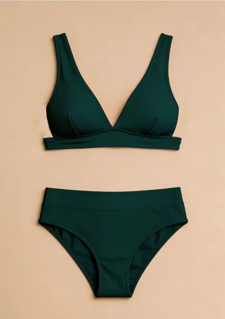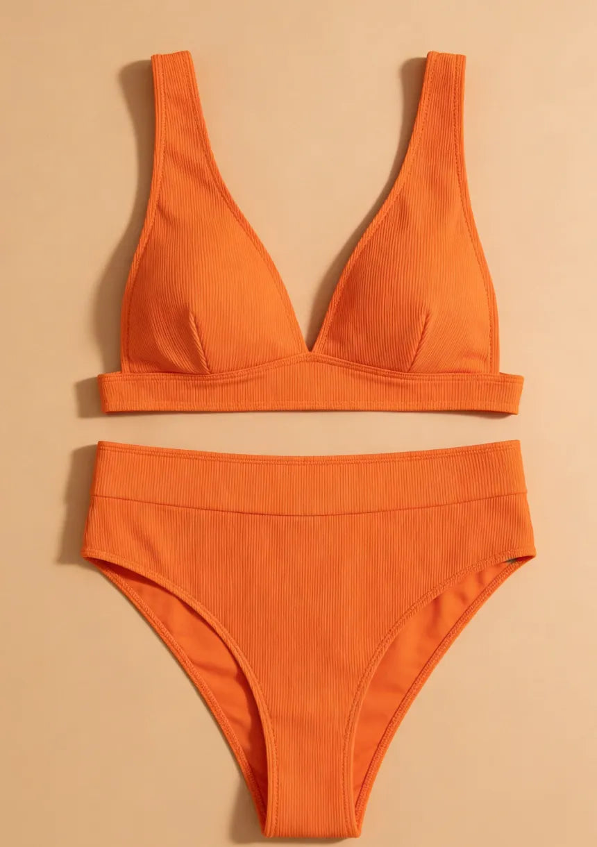 Potrzebujesz dwuczęściowego stroju kąpielowego, który oprócz wygody zapewnia fenomenalny wygląd? Właśnie go znalazłaś! Ten zestaw składa się z pięknego stanika, który podkreśla piersi, oraz dołu z wysokim stanem. Biustonosz zapinany na plecach. Majtki uszyte z tego samego prążkowanego materiału, maskują brzuszek i podkreślają pośladki.