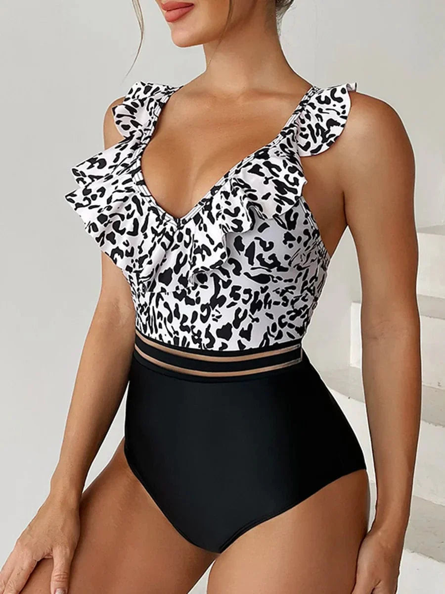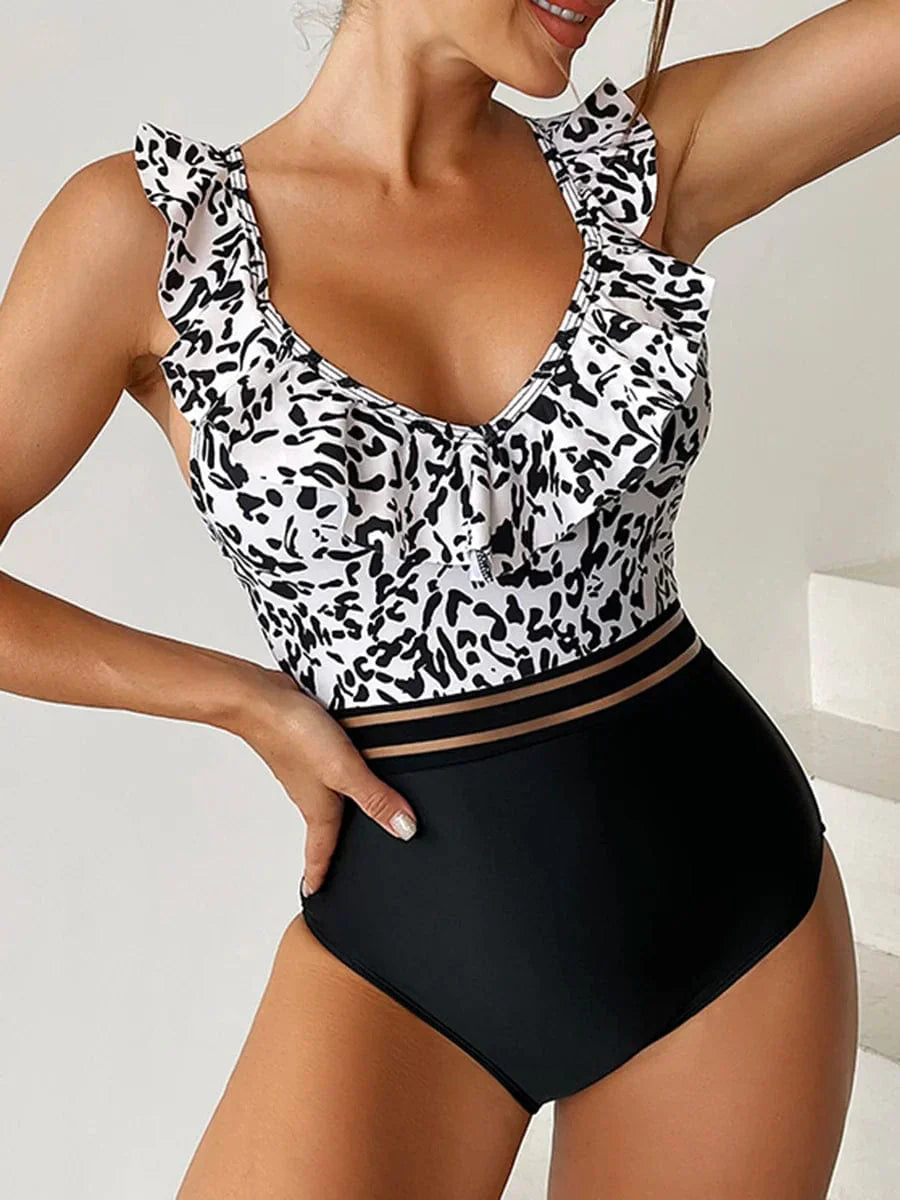 Falbanka oraz krzyżowe ramiączka nadają charakteru, a regulowane elementy zapewniają komfort noszenia. Przezroczyste akcenty subtelnie akcentują talię, tworząc zmysłowy efekt, który z pewnością przyciągnie spojrzenia.