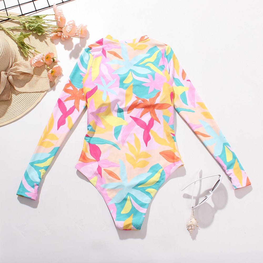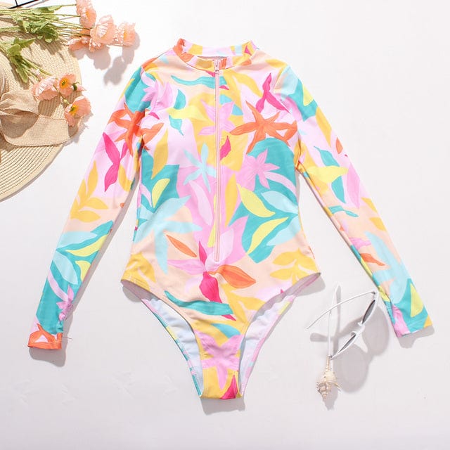 Wyraź swój styl na plaży dzięki temu jednoczęściowemu kostiumowi kąpielowemu, który łączy funkcjonalność z modnym wyglądem. Długi rękaw oraz wielobarwny wzór sprawiają, że będziesz wyglądać niezwykle, a zapięcie na suwak ułatwi Ci przygotowanie do kąpieli.