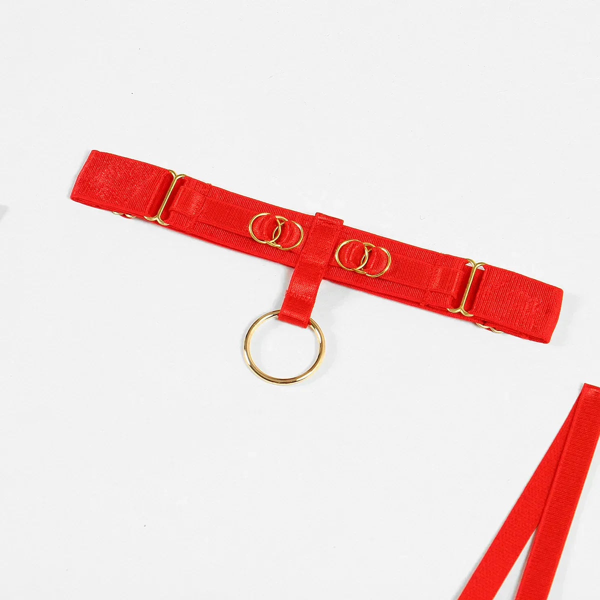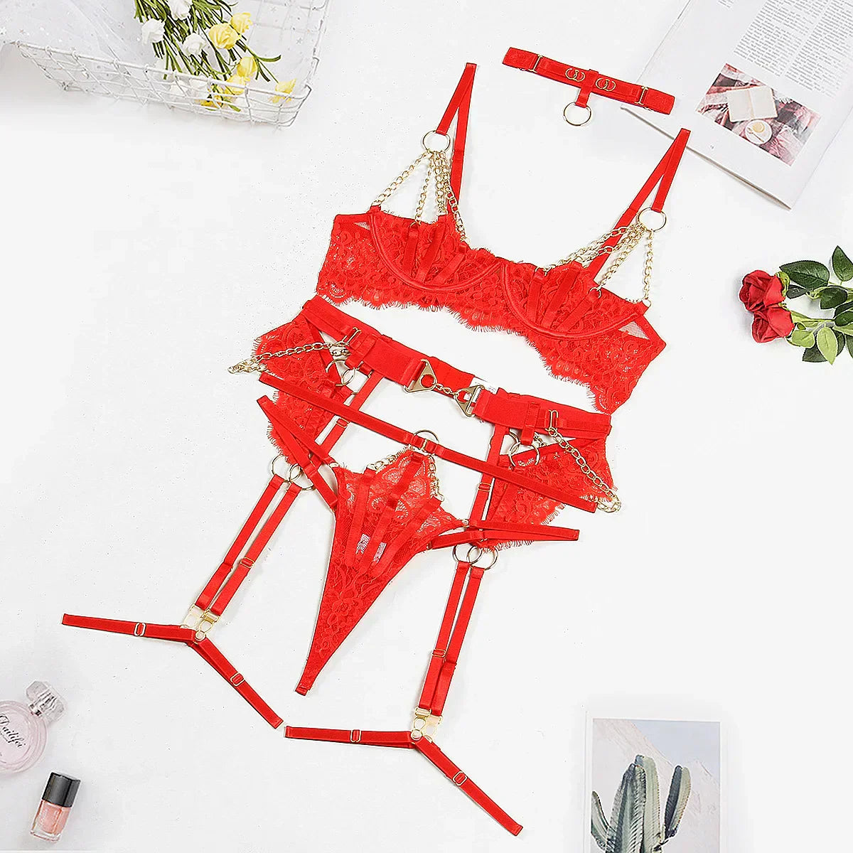 - Kompletny zestaw - zawiera biustonosz, choker, stringi oraz pas do pończoch, tworząc harmonijną całość.