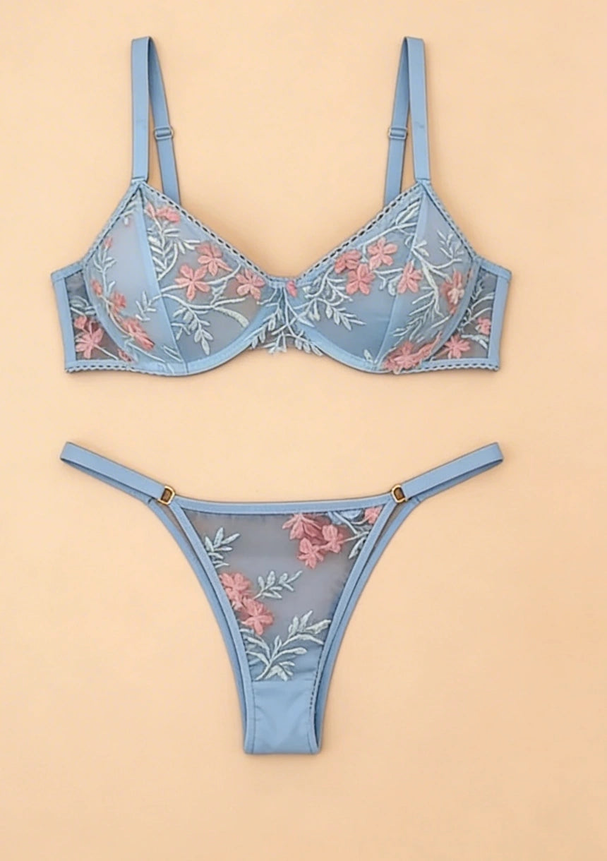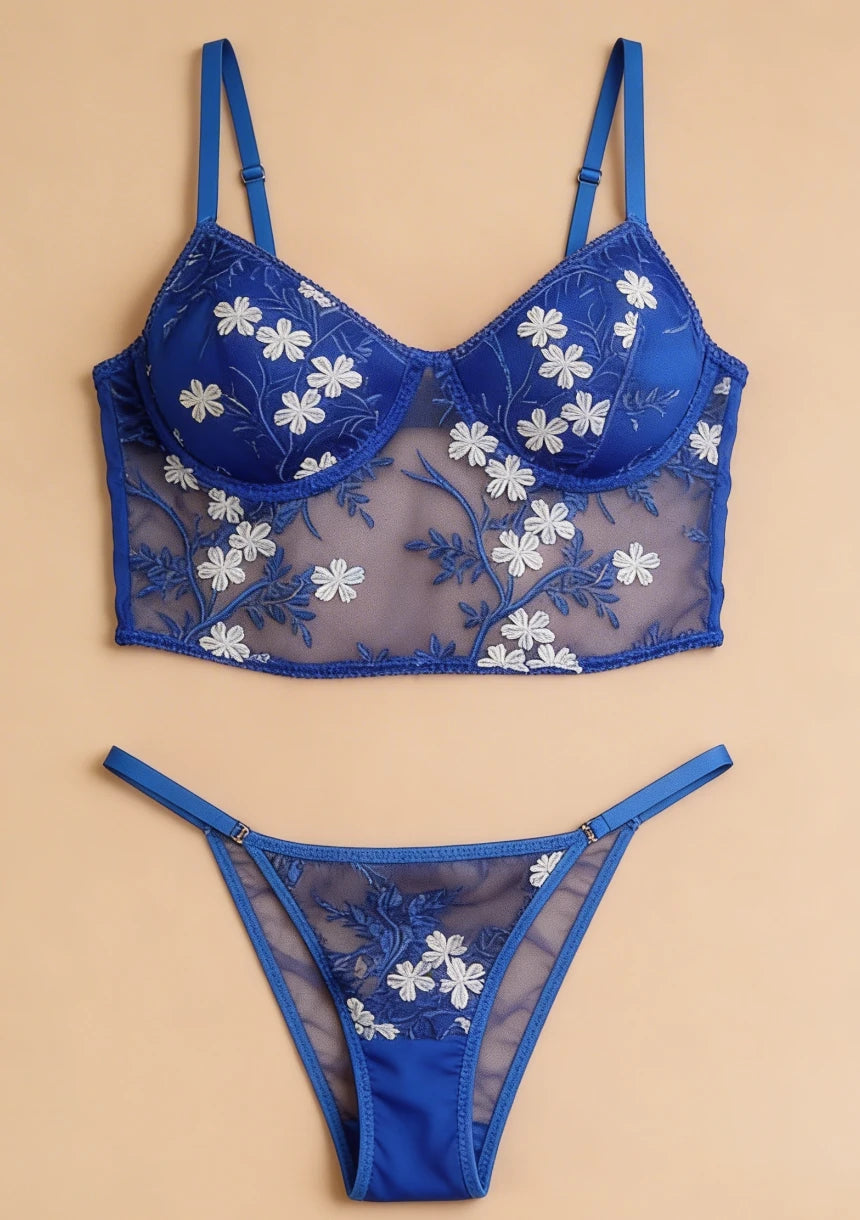 Komplet bielizny koronkowej z motywem kwiatów dostępny jest w dwóch kolorach - niebieskim oraz granatowym. Komplety bielizny damskiej od Maybella.pl są doskonałym pomysłem na prezent dla bliskiej osoby. Bielizna damska dostępna w naszej ofercie jest szyta z najwyższej jakości materiałów oraz z dbałością o wszystkie szczegóły. Zachęcamy do zakupów!