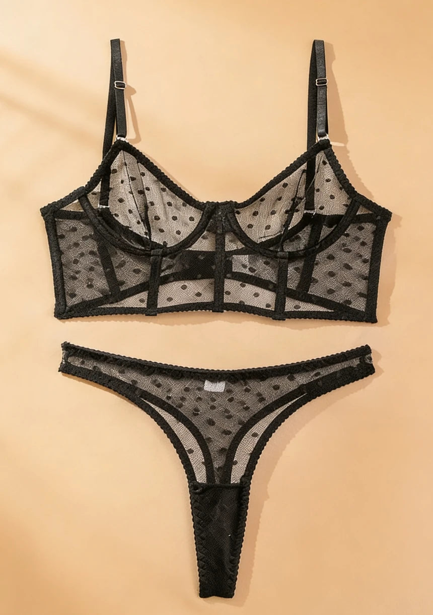 Przygotuj się na odkrycie niezwykłego kompletu bielizny, który łączy w sobie elegancję z nutą zabawy. Dzięki transparentnemu materiałowi każda chwila stanie się wyjątkowa.
