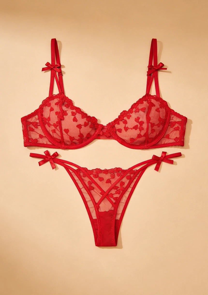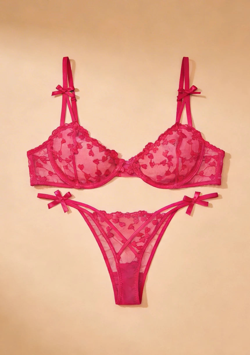 Komplet bielizny w serduszka z ozdobnymi kokardkami