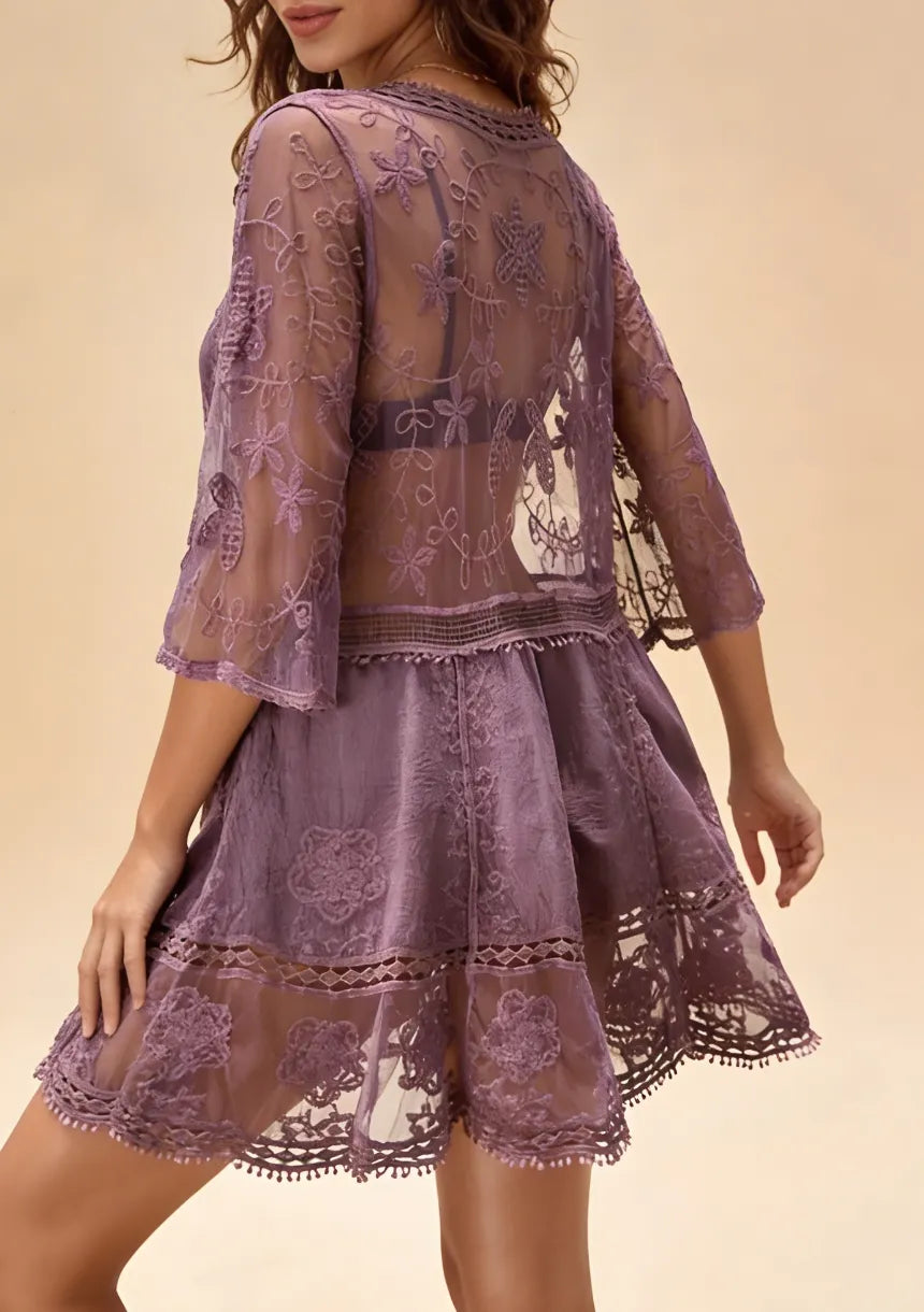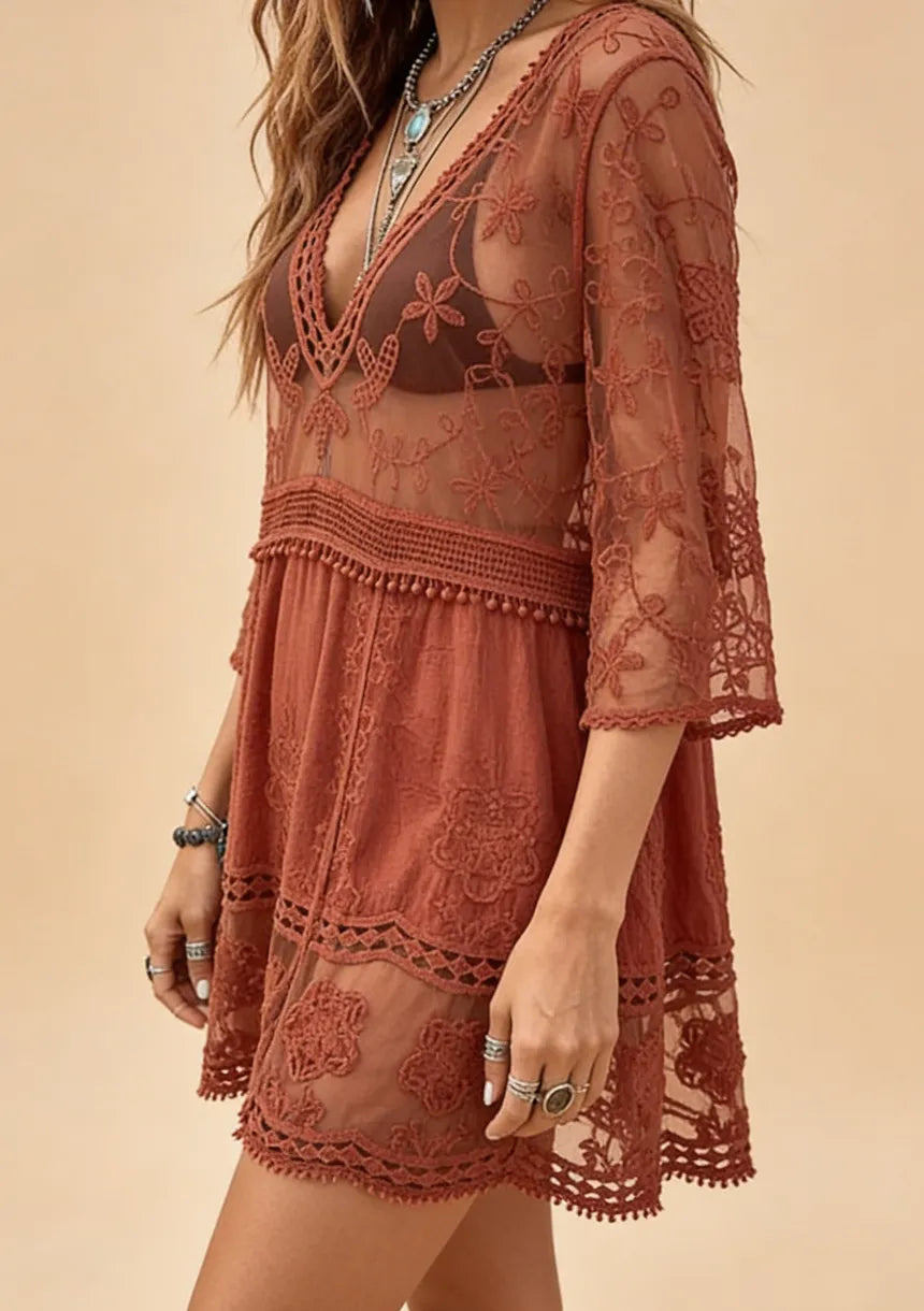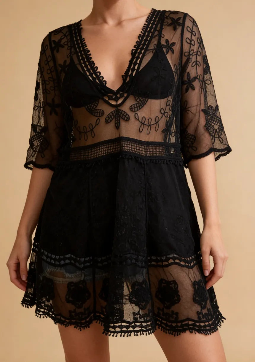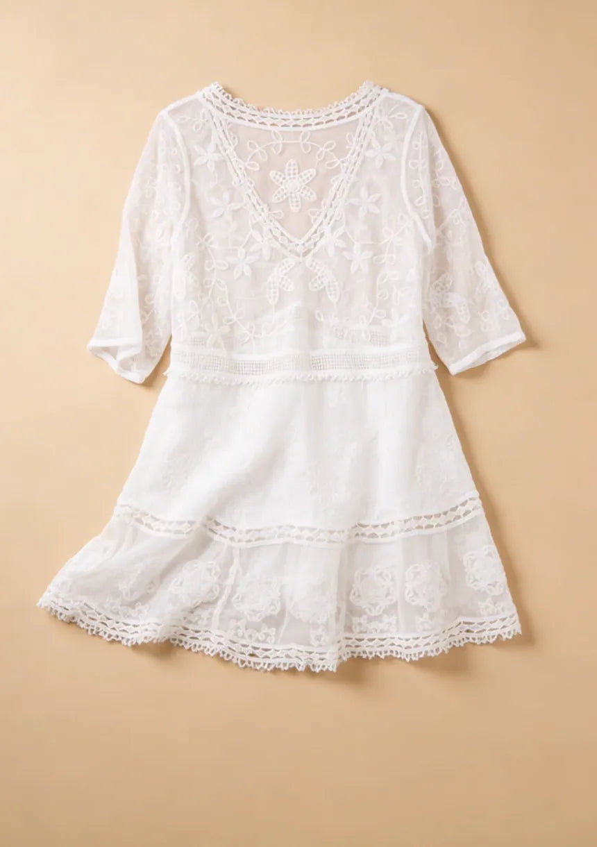 Nasza sukienka wykonana jest z przewiewnego materiału, zdobiona uroczym motywem kwiatów z koronkowym wykończeniem. Pozwól się wyróżnić!