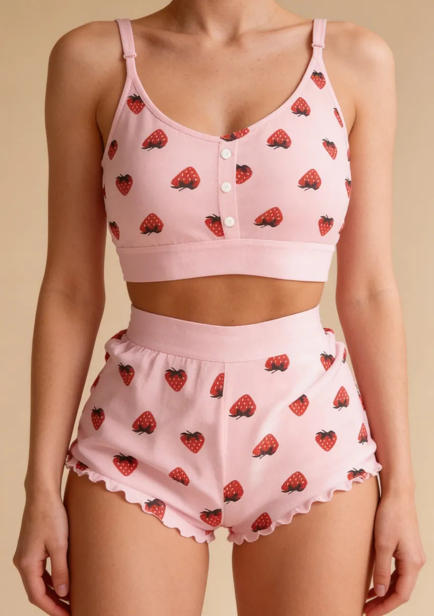 Prezentowany model to idealna propozycja bielizny na upalne, letnie noce. Piżama składa się z krótkiego, dopasowanego topu oraz spodenek z podwyższonym stanem. Soczysty nadruk truskawek oraz delikatna falbanka sprawiają, że piżama jest wyjątkowo urocza. Wykonana z najwyższą starannością oraz z najwyższej jakości materiału. To ponadczasowa propozycja dla kobiet w każdym wieku. Krótka piżama damska z motywem truskawek doskonale układa się na ciele i eksponuje kobiece krągłości.