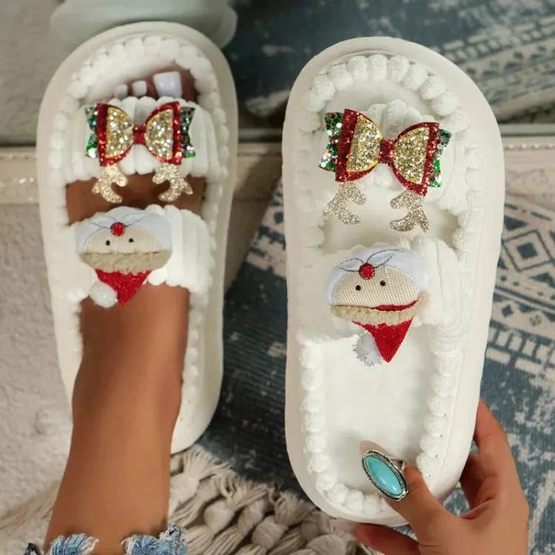 Oto miękkie kapcie damskie ze świątecznym motywem, idealne na co dzień i wyjątkowo urocze podczas świąt. W kolorach białym, różowym i żółtym, ozdobione wzorami Mikołaja i kokardką, te puchate, wsuwane kapcie są doskonałym towarzyszem domowego komfortu.