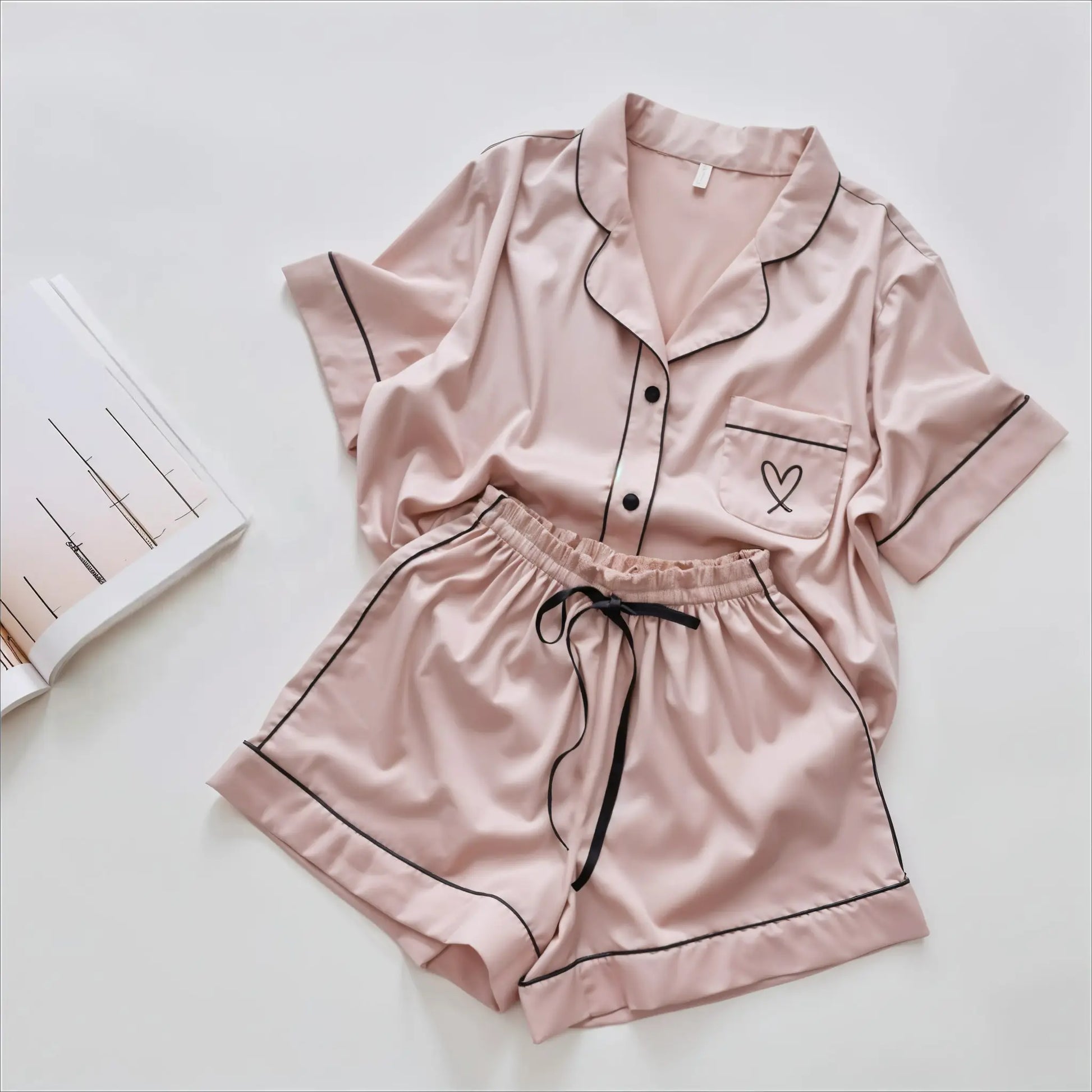 Piżama dwuczęściowa składa się z bluzki koszulowej z krótkim rękawem i eleganckim kołnierzykiem, oraz z krótkich, ściąganych w pasie spodenek. Maybella proponuje piżamę w pięknym odcieniu różu z elegancką, kontrastową lamówką w kolorze czarnym. Piękno wykończenia tego modelu podkreśla urocza kieszonka umiejscowiona na wysokości biustu z uroczym wzorem serca.