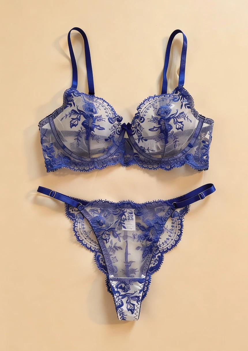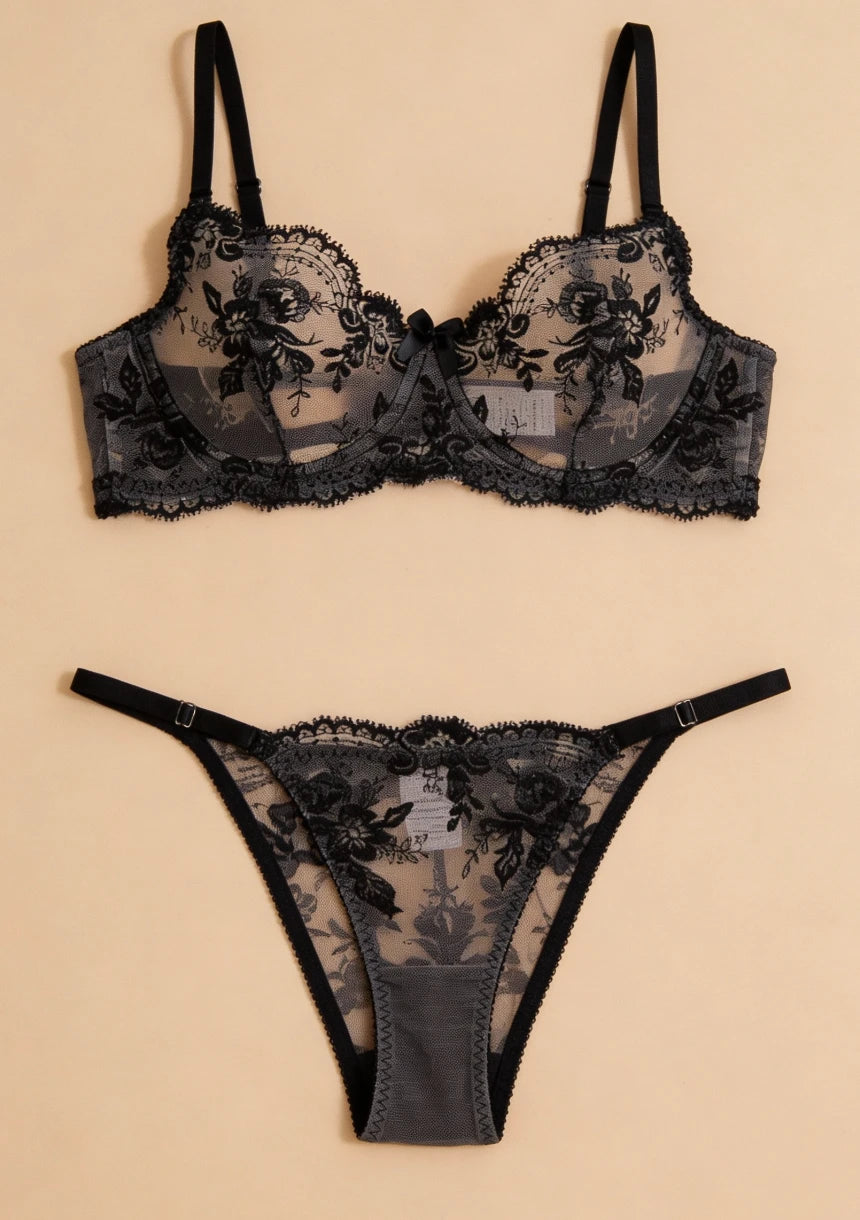 Biustonosz z koronkowym wykończeniem oraz kwiatowym haftem pięknie podkreśla biust, dodając mu delikatności. Stringi dopełniają całość, tworząc zmysłowy i elegancki wygląd.