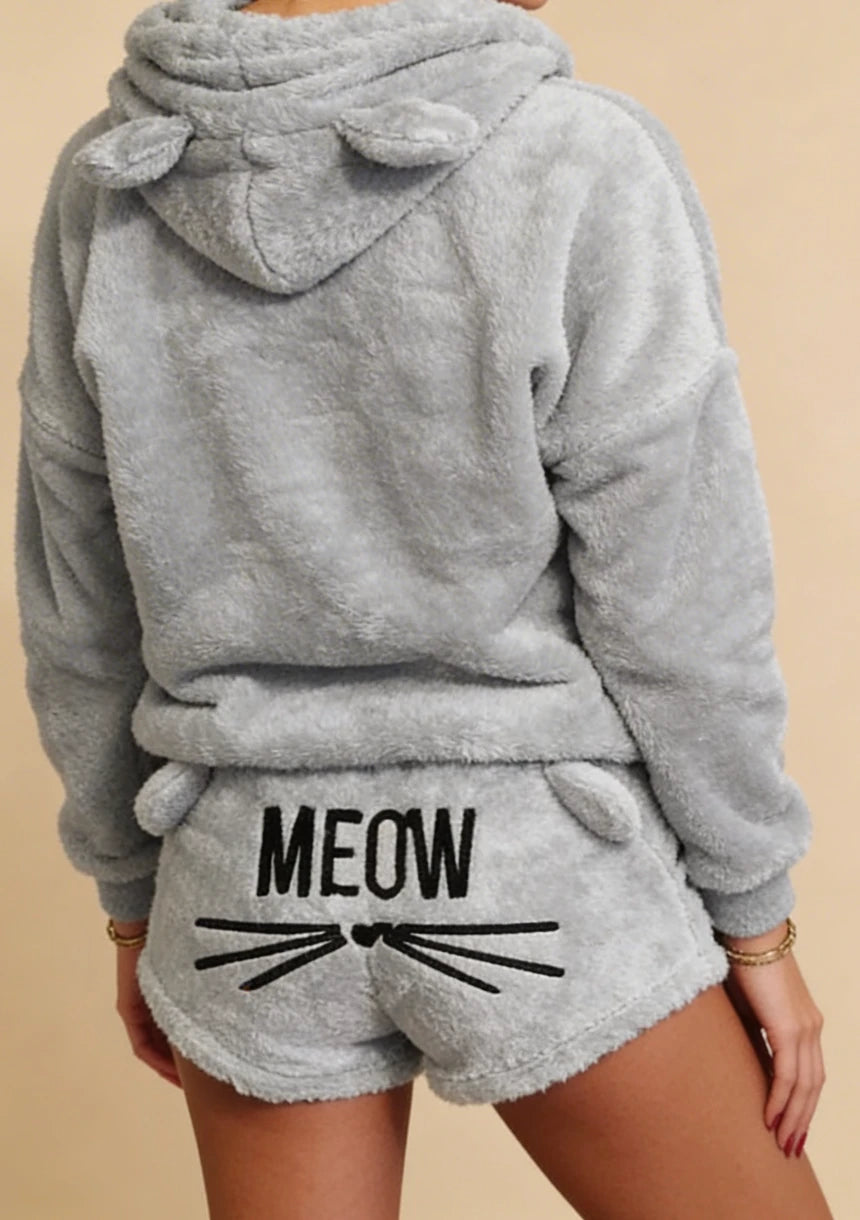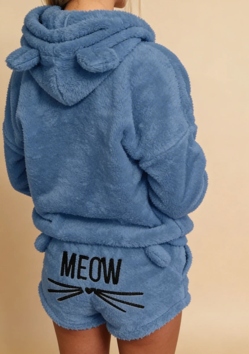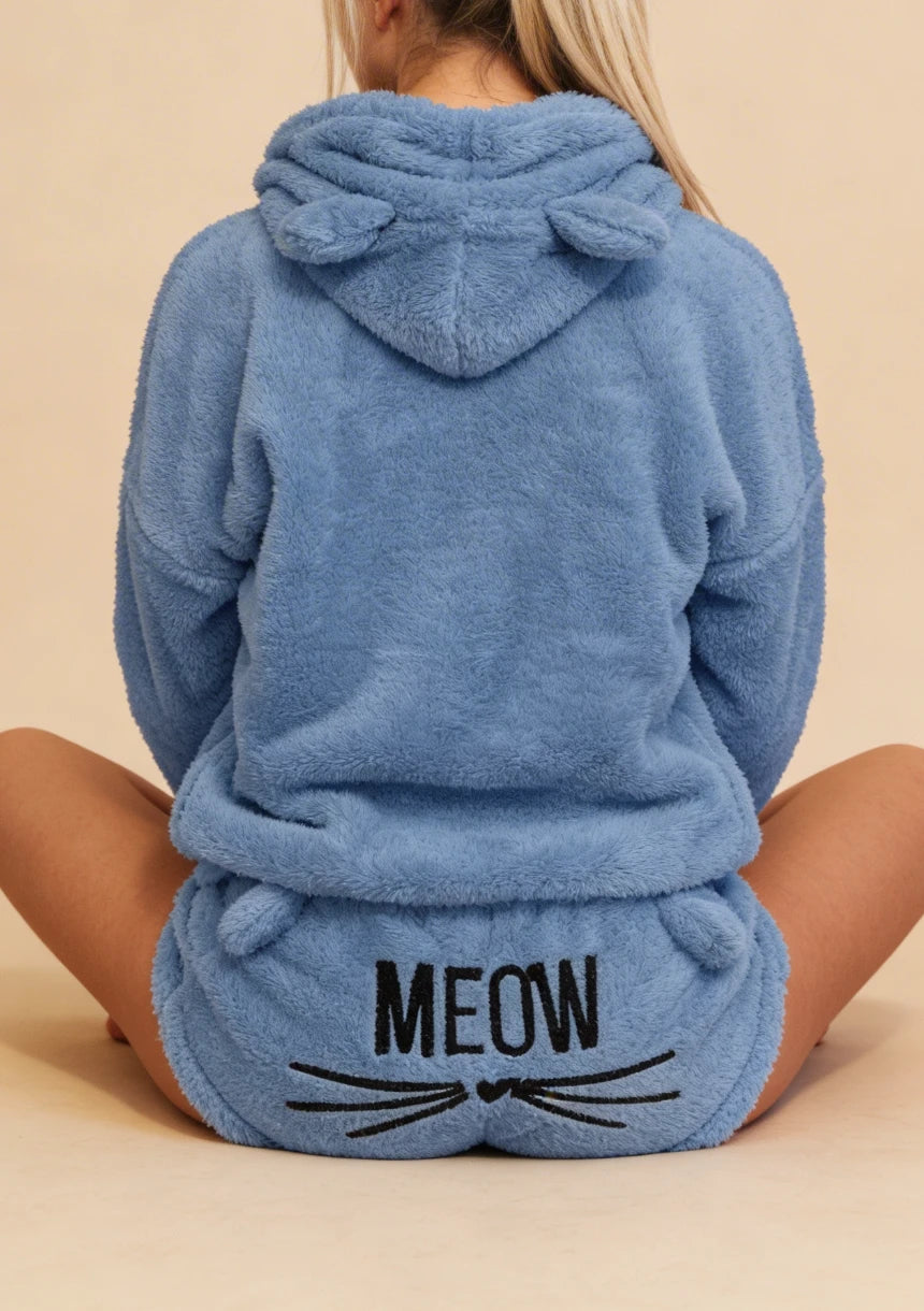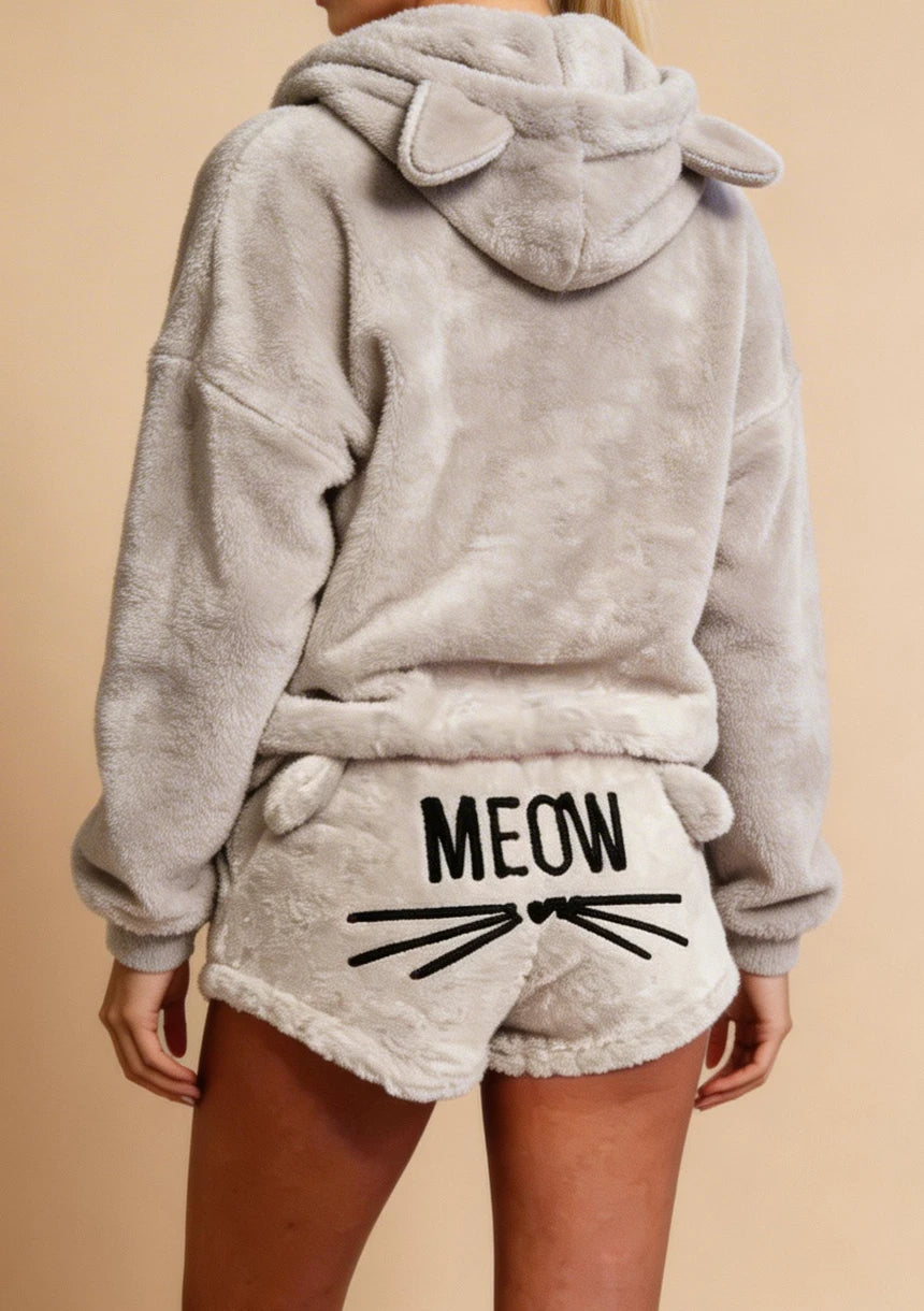 Odkryj wygodę i styl w jednym! Zamów teraz i ciesz się relaksem w domowym zaciszu z naszym puchatym kompletem odzieży domowej z motywem kotka.