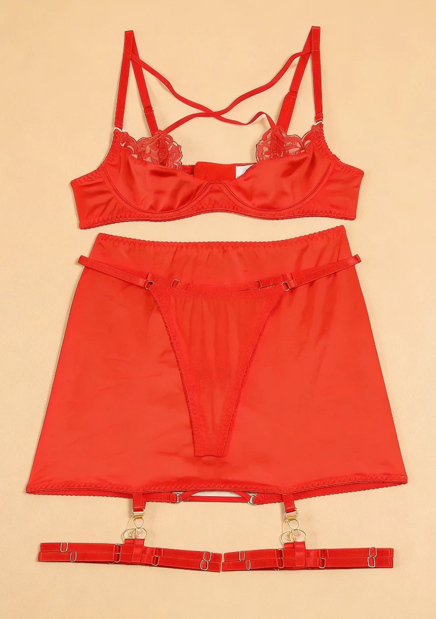 - Kompletny zestaw - zawiera biustonosz, stringi, spódniczkę oraz podwiązki