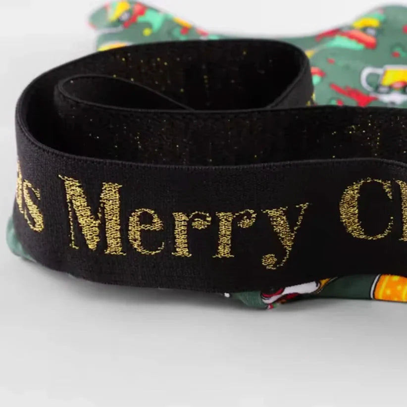 - Markowa Gumka: Szeroka, elastyczna guma w pasie z napisem "Merry Christmas" w złotym kolorze – dodaje świątecznej elegancji i zapewnia idealne dopasowanie.